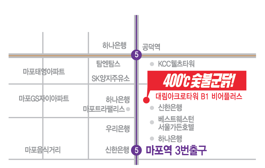 마포지점]군닭400&국수 오픈! 서울 마포구 도화동 563번지 대림아크로타워 B1 비어플러스 전화예약 02 3272 3947 400도 숯불군닭!